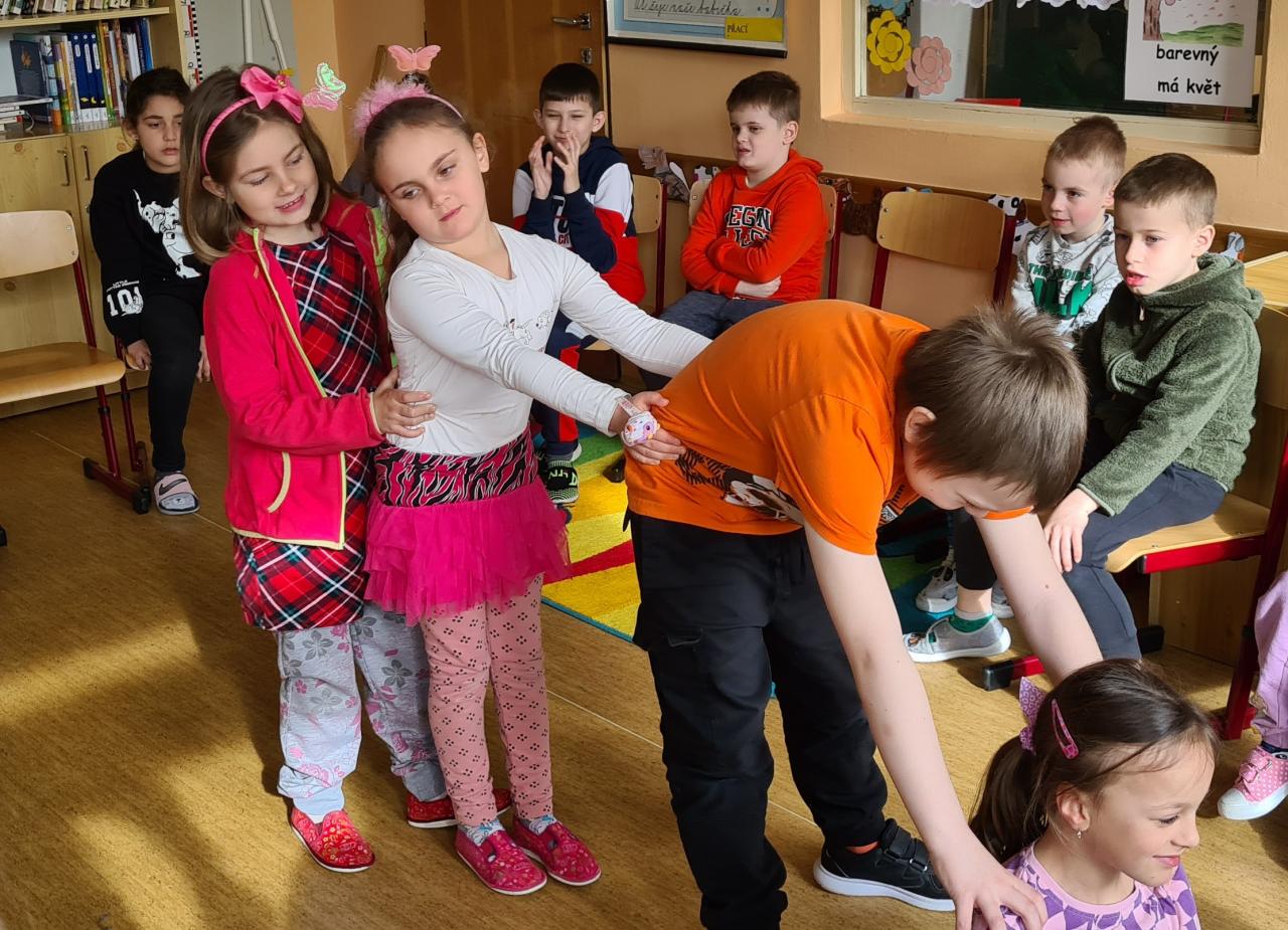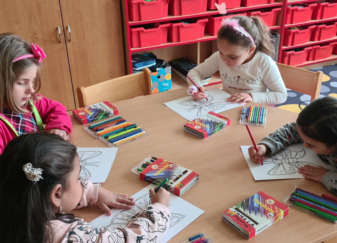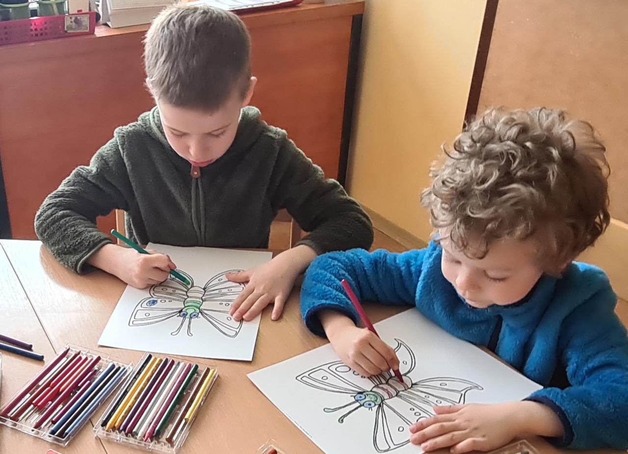 Nastávající prvňáčci navštívili výuku v sousední základní škole a prohlédli si i družinu, kde si vyrobili motýlka.