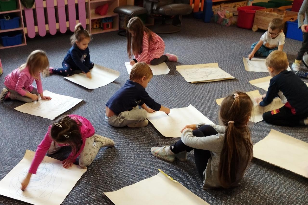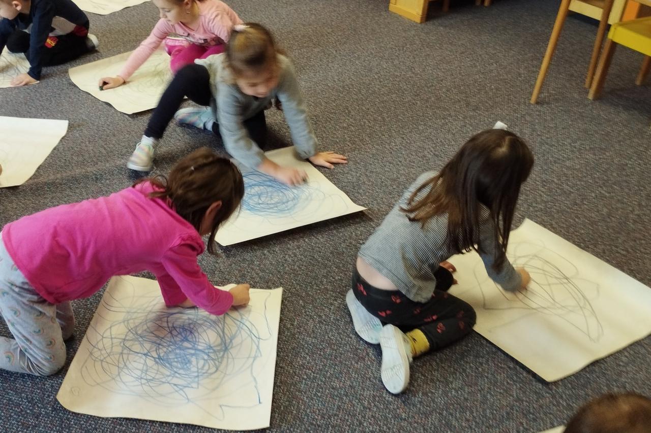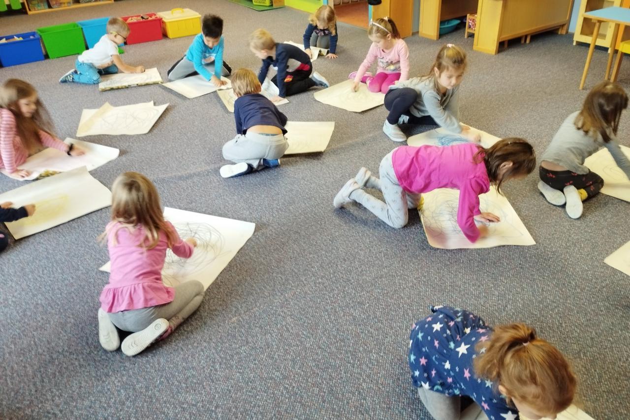 Vítr fouká pofukuje, už k nám zima nakukuje - dělali jsme si honičku ve větru s dračími ocásky, dračí cesty jsme si nakreslili a nakonec k nám i barevní dráčci přiletěli.