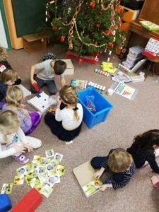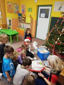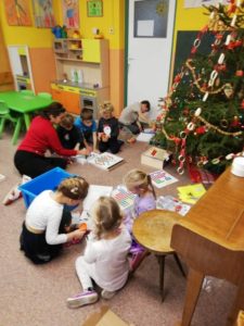 Na svatého Martina jsme si vyrobili bílé koníky z ponožek, zpívali jsme písničky, hráli jsme příběh o sv. Martinovi, jezdili na konících. Vyrobili jsme si ve školce peklíčko i nebíčko, hráli jsme si na čertíky, plnili čertovské úkoly a přivítali Mikuláše, anděla i čerta v našem peklíčku, dostali jsme mikulášský balíček a pekelné vysvědčení. Zacvičili jsme si v tělocvičně ZŠ s fotbalovým trenérem. Těšili jsme se na Ježíška ve školce, zazpívali jsme si koledy, poznali jsme Betlémský příběh o narození Ježíška a rozbalili dárky pod vánočním stromečkem. To bylo radosti.