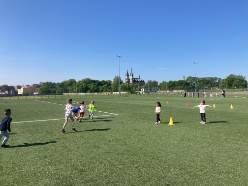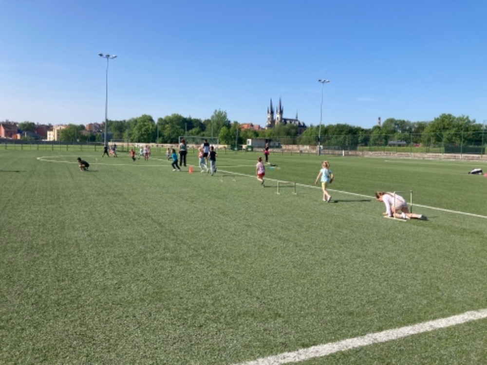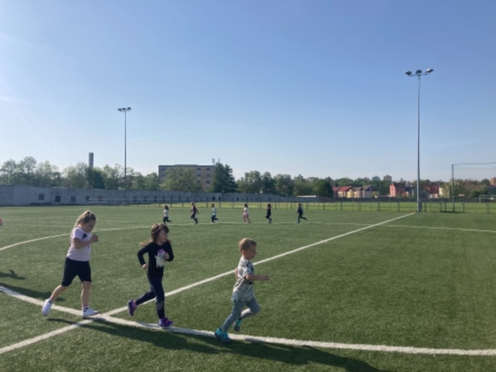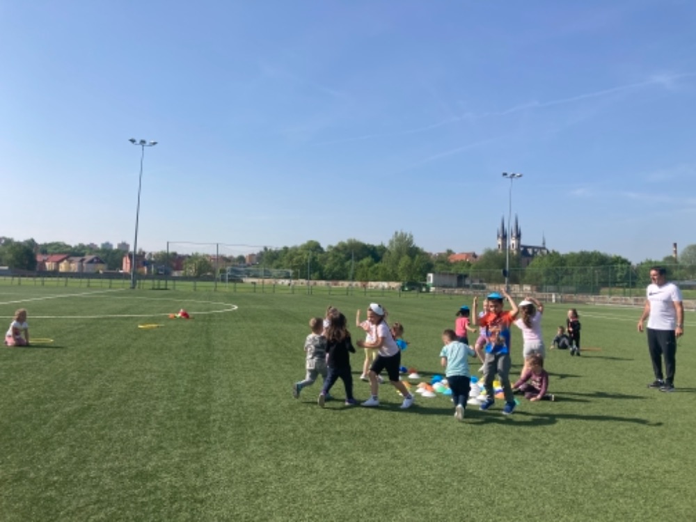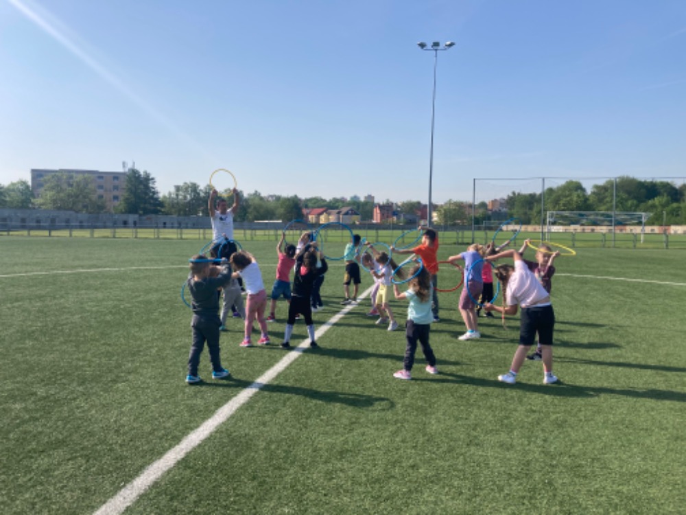 Díky hezkému počasí jsme začali cvičit na fotbalovém hřišti. Hrajeme nové pohybové hry, cvičíme zdravotní cviky a užíváme si spoustu zábavy.